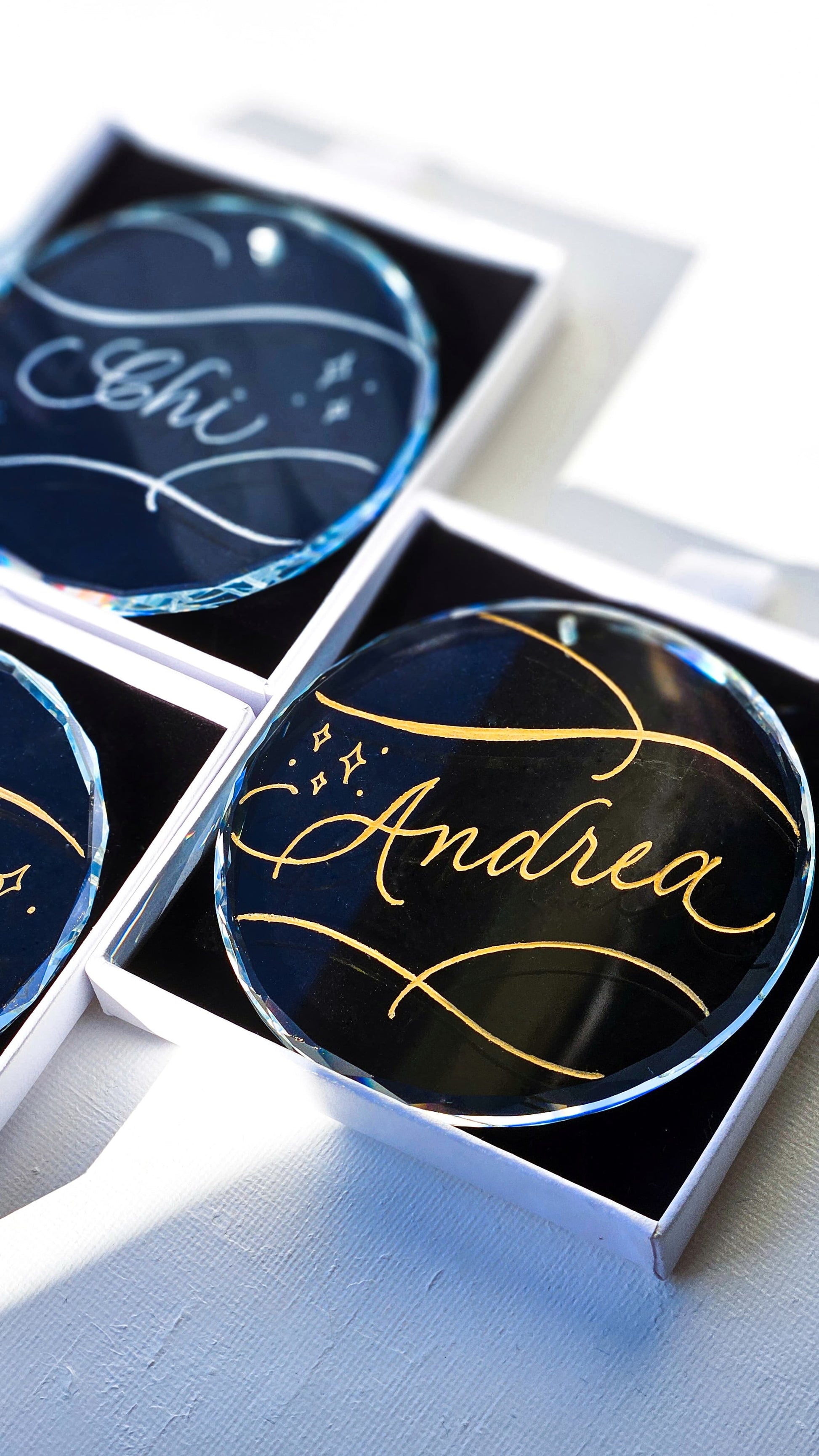 - Each bauble is individually hand-engraved in The Chelle Studio’s calligraphy script for a bespoke finish (see product photos)